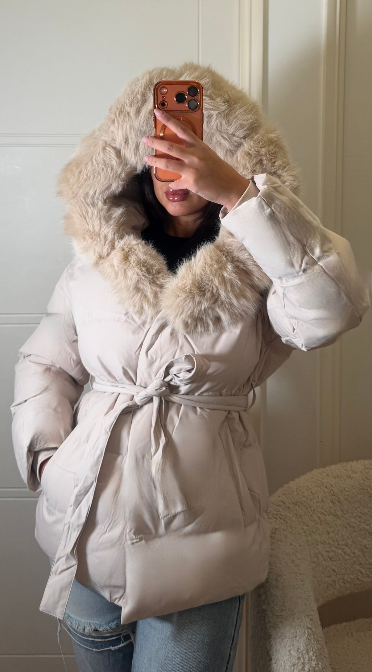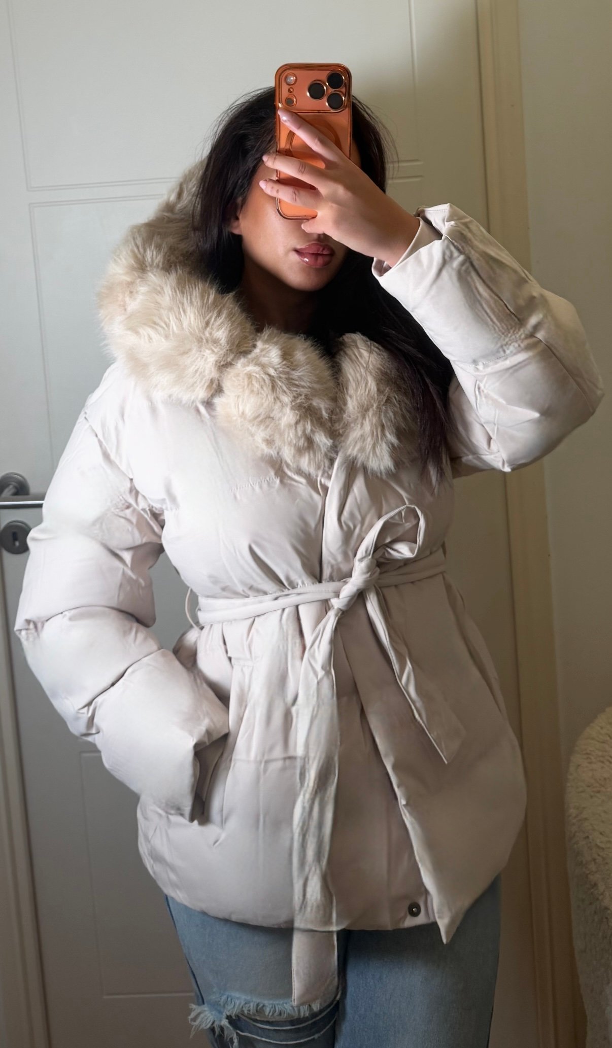 Doudoune épaisse couleur crème avec grosse capuche en fourrure et ceinture à la taille idéale pour passer l’hiver au chaud!